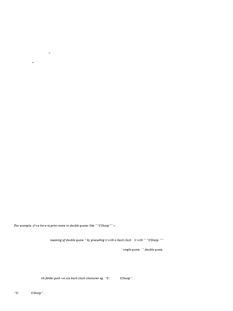 For example, if we have to print name in double quotes like ““CSharp”” – this will give you compile time error. It can be achieved by using \