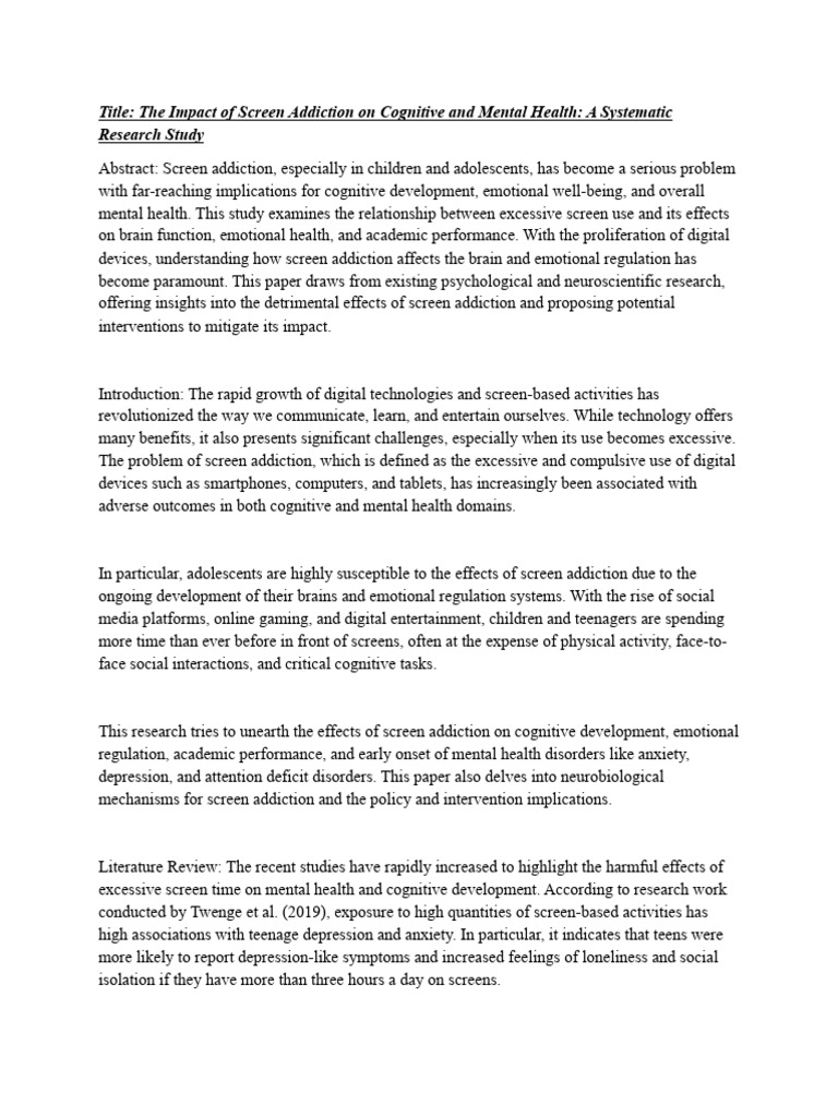 Title: The Impact of Screen Addiction on Cognitive and Mental Health: A Systematic