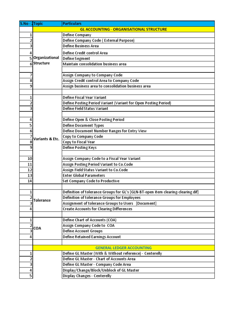 Particulars GL ACCOUNTING - ORGANISATIONAL STRUCTURE Define Company Define Company Code ( External Purpose) Define Business Area
