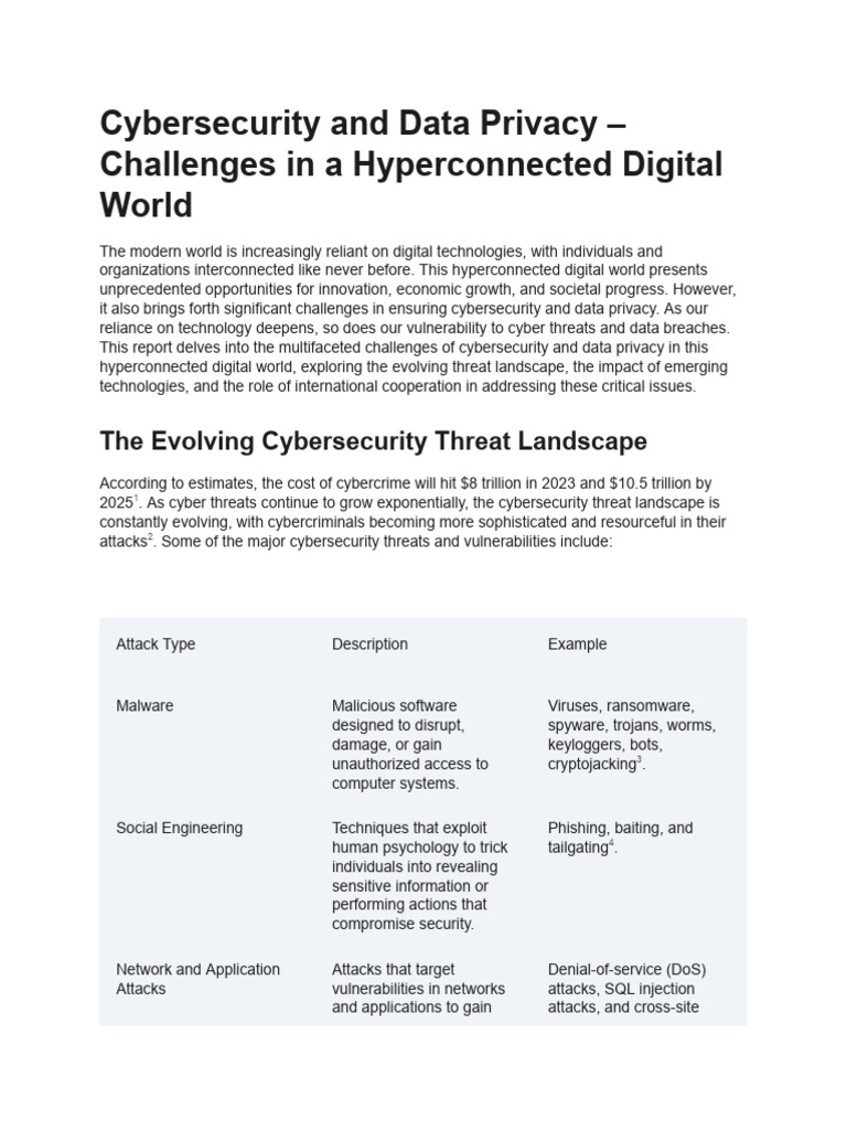 This report delves into the multifaceted challenges of cybersecurity and data privacy in this