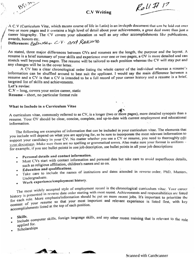 ‘A curriculum vitae, commonly referred to as CV, is a longer (two or more pages), more detailed synopsis than a