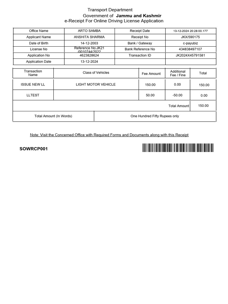 Note: Visit the Concerned Office with Required Forms and Documents along with this Receipt