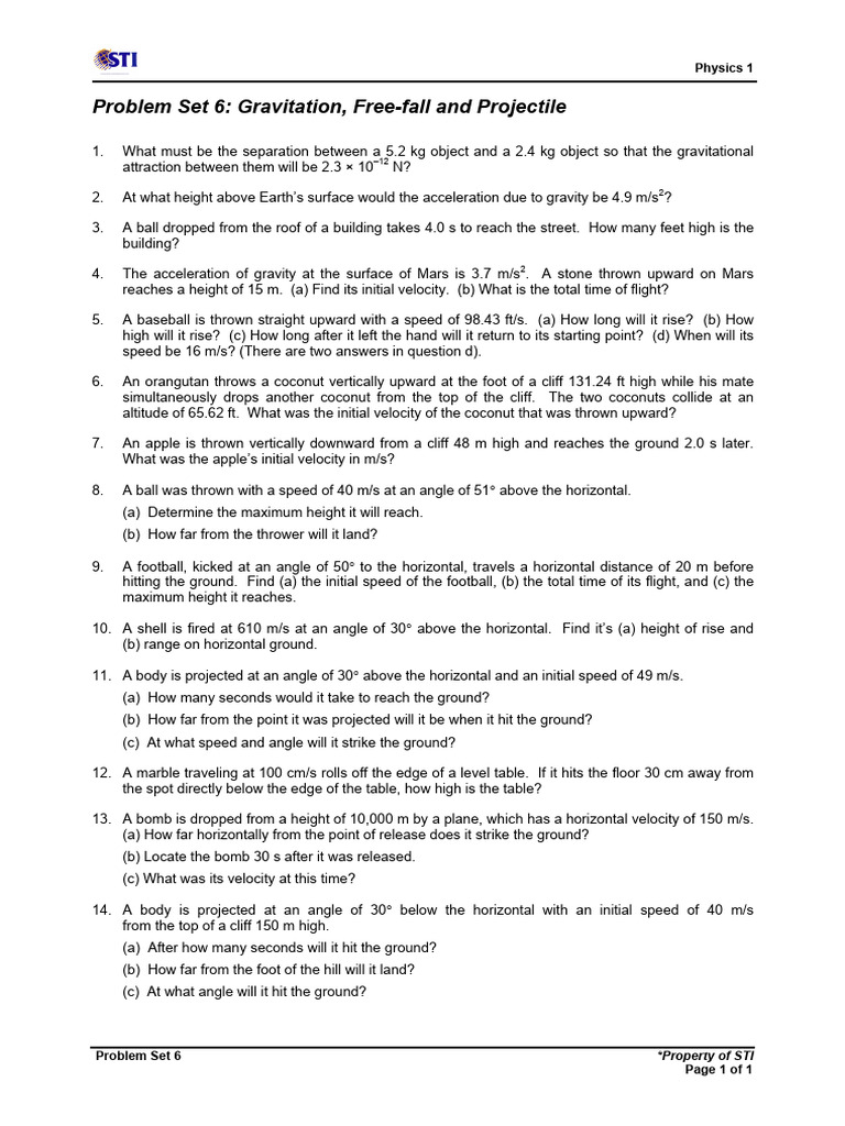 Problem Set 6: Gravitation, Free-fall and Projectile