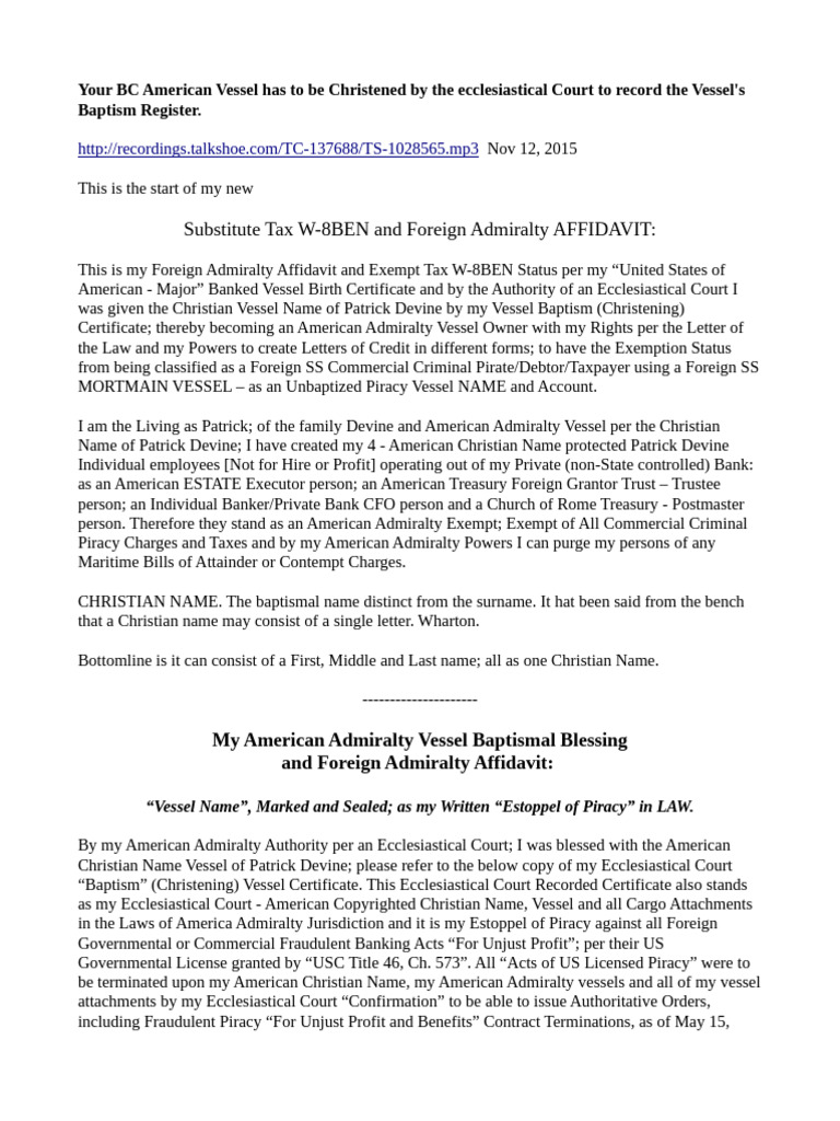 This is my Foreign Admiralty Affidavit and Exempt Tax W-8BEN Status per my “United States of