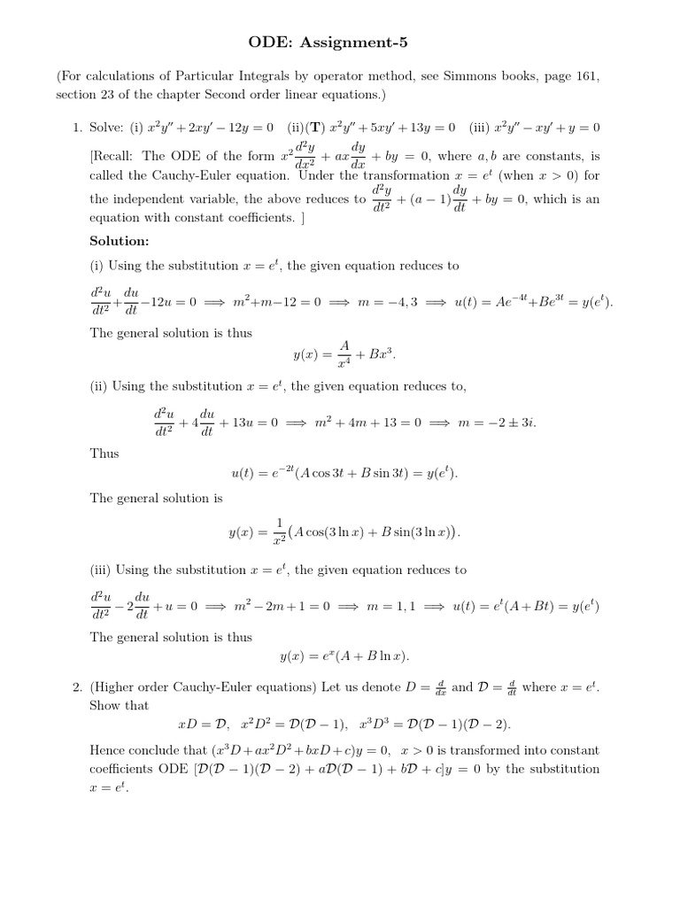 1. Solve: (i) x2 y 00 + 2xy 0 − 12y = 0 (ii)(T) x2 y 00 + 5xy 0 + 13y = 0 (iii) x2 y 00 − xy 0 + y = 0