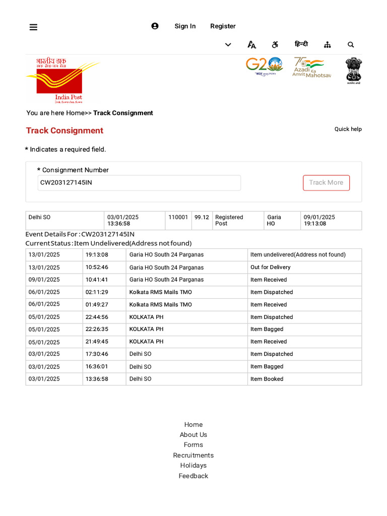 13/01/2025 19:13:08 Garia HO South 24 Parganas Item undelivered(Address not found)