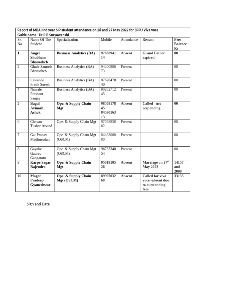 Report of MBA IInd year SIP student attendance on 26 and 27 May 2022 for SPPU Viva voce