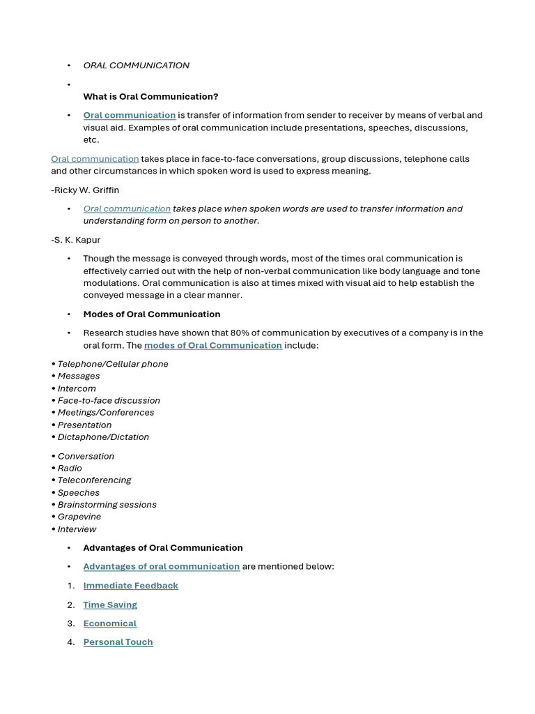 • Oral communication is transfer of information from sender to receiver by means of verbal and