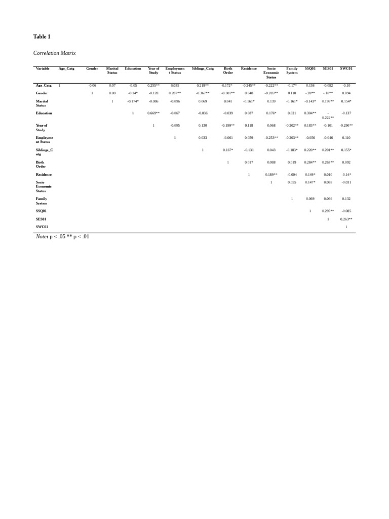 Variable Age_Catg Gender Marital Education Year of Employmen Siblings_Catg Birth Residence Socio Family SSQ01 SES01 SWC01