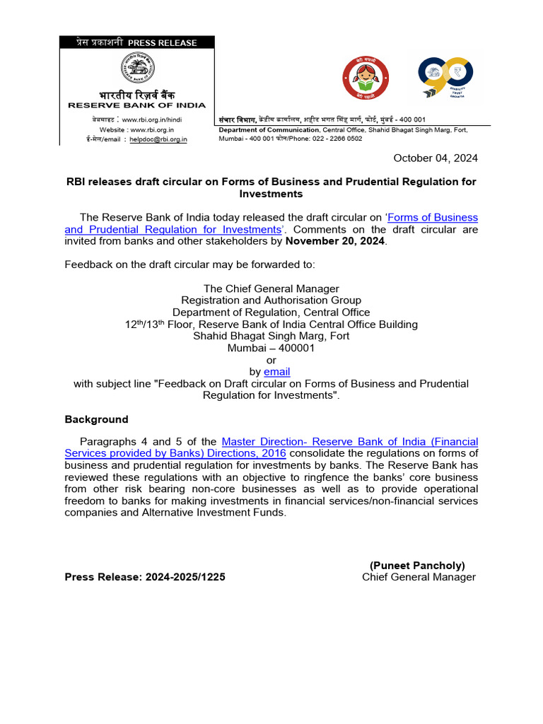 RBI releases draft circular on Forms of Business and Prudential Regulation for