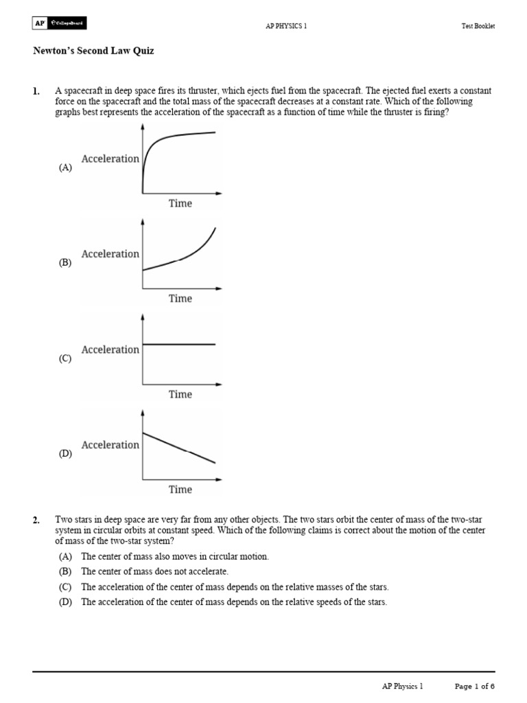 1. A spacecraft in deep space fires its thruster, which ejects fuel from the spacecraft. The ejected fuel exerts a constant