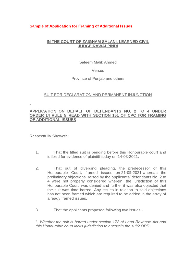 Application U/O _____ Rule _____ of CPC for Framing Additional Issue.