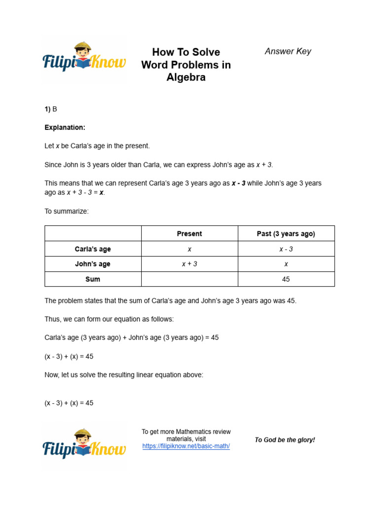 This means that we can represent Carla’s age 3 years ago as x - 3 while John’s age 3 years