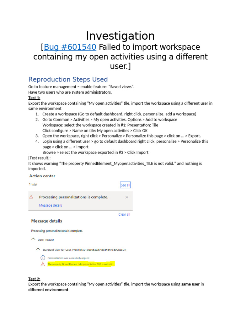 After removing the above changes, we are able to import the workspace containing “My open activities”