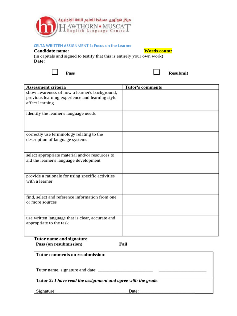 CELTA WRITTEN ASSIGNMENT 1: Focus on the Learner