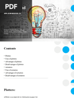 PRINTERS : Non- impact printer & plotter use laser techniques , ink jet sprays, xerographic processes, electrostatic methods & electro thermal methods to get images. PLOTTERS : Drafting layouts & other drawings are generated with pen plotters. A pen plotter has one or more pens mounted on a carriage, or crossbar that spans a sheet of paper Pens with varying colors & widths are used to produce a variety of shadings & line styles Wet- ink , ball point & felt tip pens are all possible choices for used with a pen plotter Printers produce output by either impact or non- impact methods. Impact printer press formed faces against an inked ribbon onto the paper such as line printer.