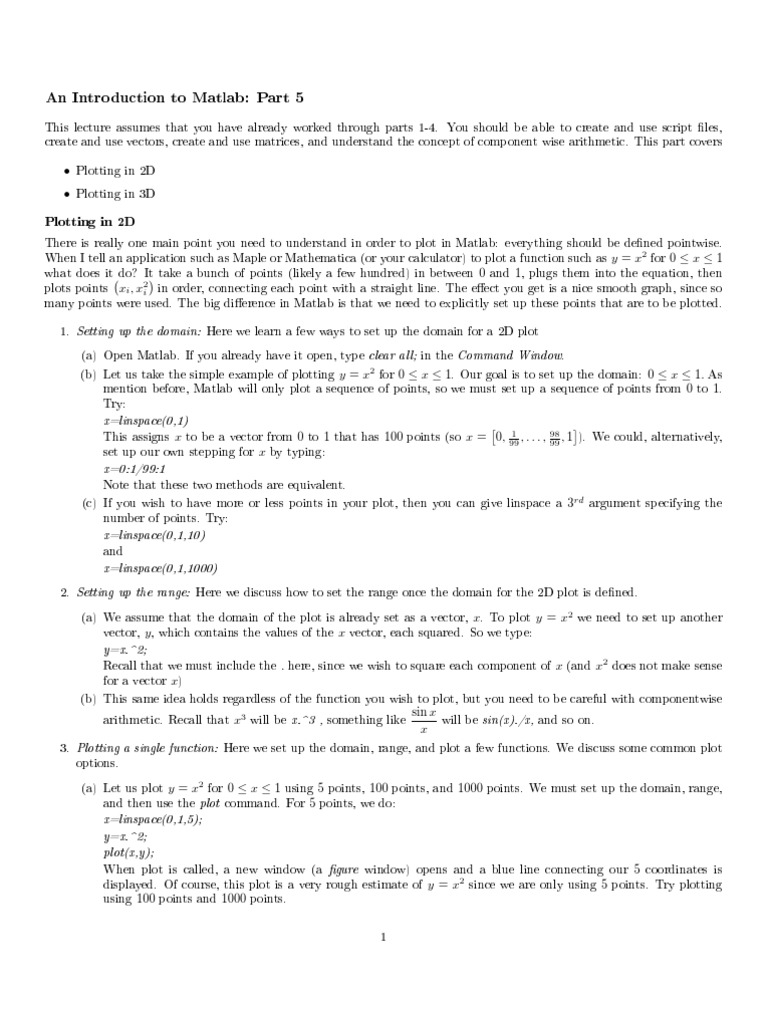 Plotting in 2D There is really one main point you need to understand in order to plot in Matlab: everything should be dened pointwise. When I tell an application such as Maple or Mathematica (or your calculator) to plot a function such as y = x2 for 0 x 1 what does it do? It take a bunch of points (likely a few hundred) in between 0 and 1, plugs them into the equation, then plots points xi , x2 in order, connecting each point with a straight line. The eect you get is a nice smooth graph, since so i many points were used. The big dierence in Matlab is that we need to explicitly set up these points that are to be plotted.