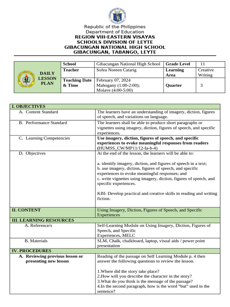 C. Learning Competencies Use imagery, diction, figures of speech, and specific
