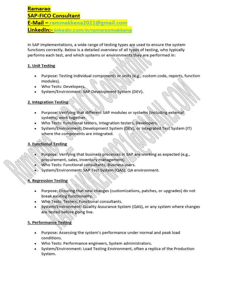 Note: These testing types and roles ensure that the SAP system functions correctly,