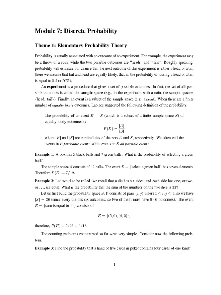 An experiment is a procedure that gives a set of possible outcomes. In fact, the set of all possible outcomes is called the sample space (e.g., in the experiment with a coin, the sample space head tail ). Finally, an event is a subset of the sample space (e.g., a head). When there are a nite number of equally likely outcomes, Laplace suggested the following denition of the probability: The probability of an event equally likely outcomes is