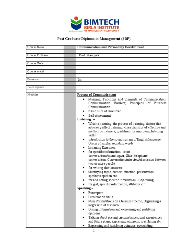 Note: Make sure you have completed the reading before the class which includes chapter and research paper. Syllabus and Operational Details: Course Overview This course is designed to enable understanding of basics of communication and enhance the English language ability used in the context of professional environment. The course covers the four basic language skills Listening, Speaking, Reading and Writing, with emphasis on activities that are common in business. The Aim of this course is to fine tune the four skills to achieve a higher degree of performance in the day to day activities in a business environment Assessment System: Internal Evaluation Continuous Assessment 100 marks Assignments and cases on Reading, Writing, Listening and Speaking Skills
