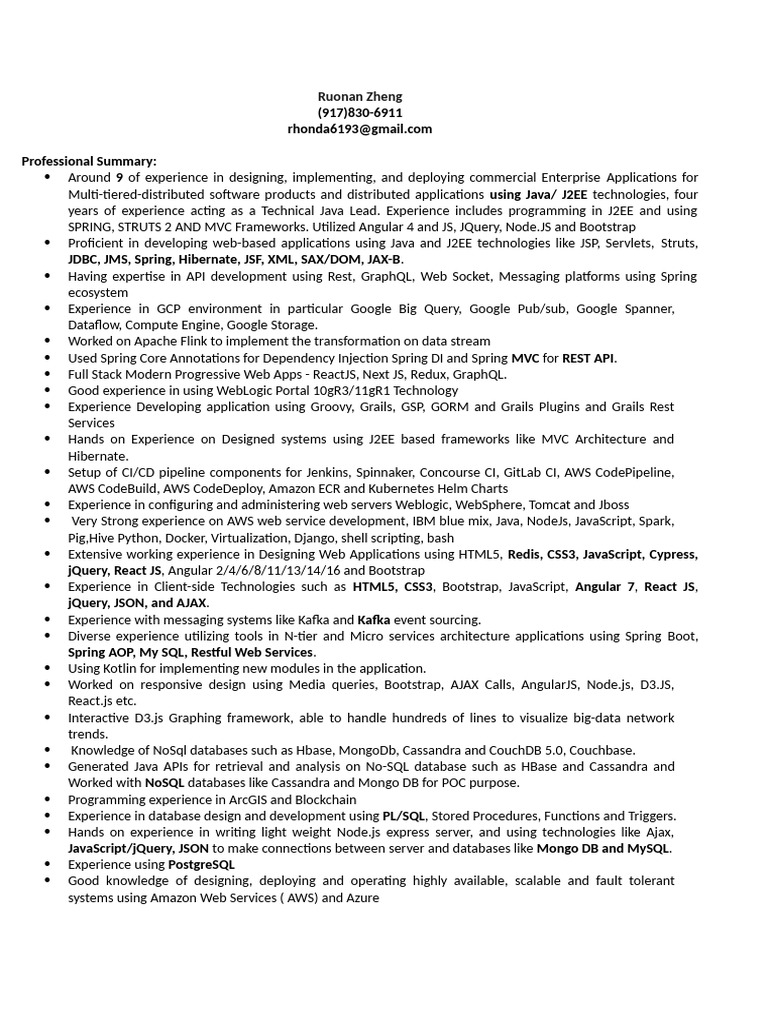years of experience acting as a Technical Java Lead. Experience includes programming in J2EE and using