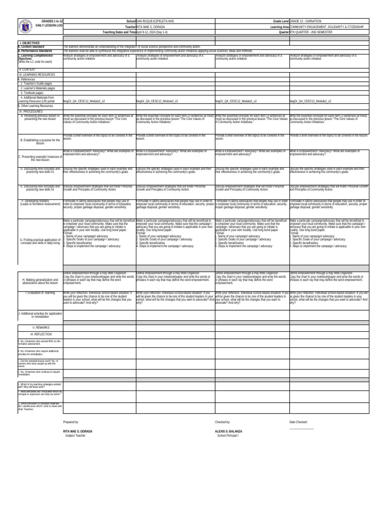 DAILY LESSON LOG Teacher RITA MAE S. ODRADA Learning Area COMMUNITY ENGAGEMENT, SOLIDARITY & CTIZENSHIP