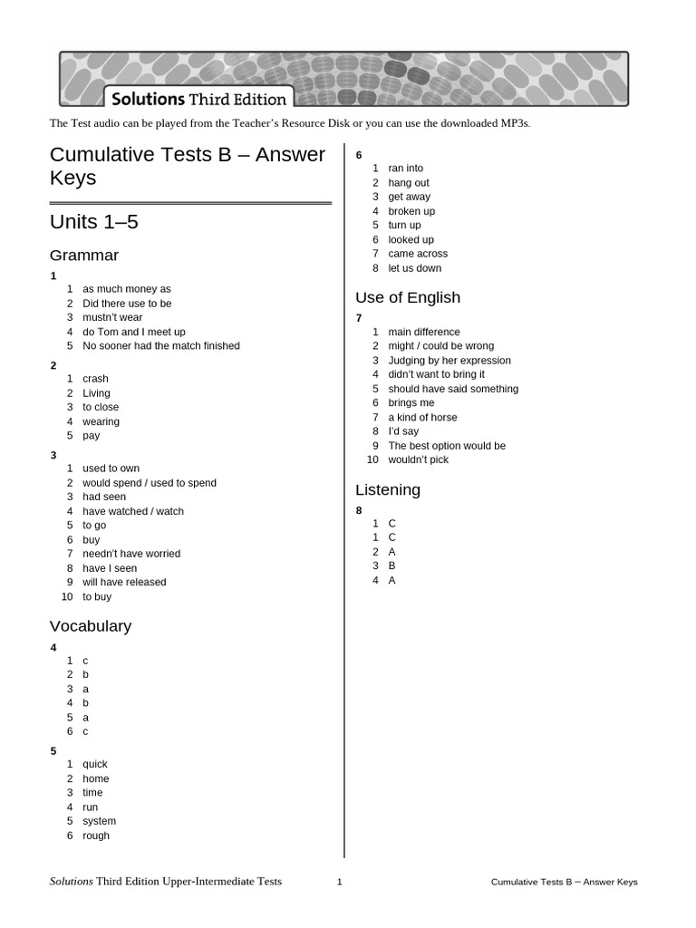 Solutions Third Edition Upper-Intermediate Tests 5 Cumulative Tests B – Answer Keys