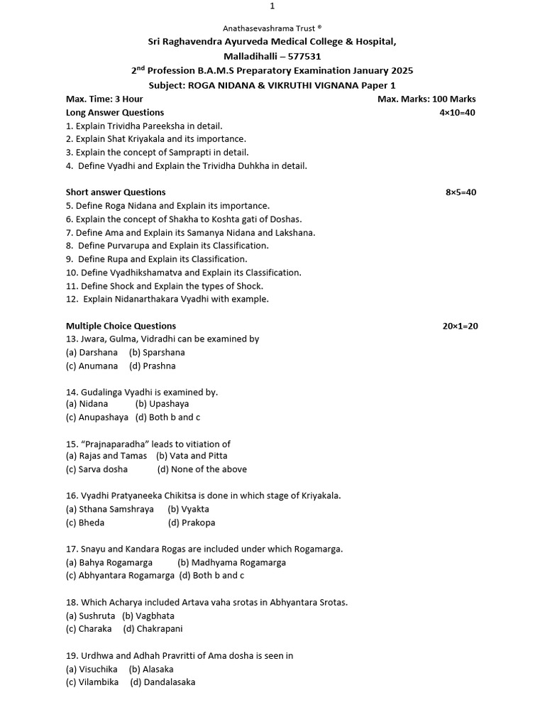 Subject: ROGA NIDANA & VIKRUTHI VIGNANA Paper 1