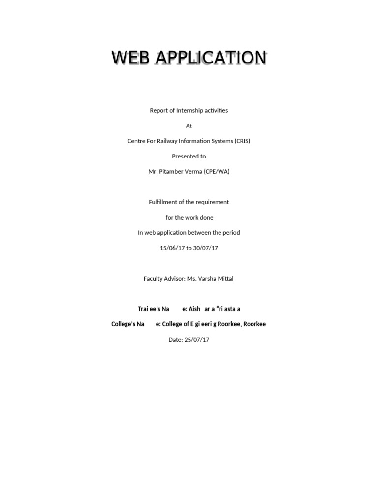 Application Department at Centre For Railway Information System, New Delhi from 15 June to 30 July