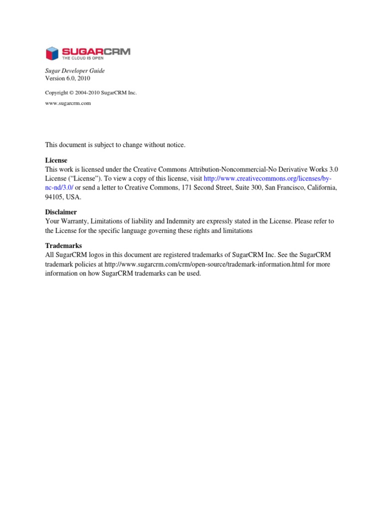 This document is subject to change without notice. License This work is licensed under the Creative Commons Attribution-Noncommercial-No Derivative Works 3.0 License (License). To view a copy of this license, visit http://www.creativecommons.org/licenses/bync-nd/3.0/ or send a letter to Creative Commons, 171 Second Street, Suite 300, San Francisco, California, 94105, USA. Disclaimer Your Warranty, Limitations of liability and Indemnity are expressly stated in the License. Please refer to the License for the specific language governing these rights and limitations Trademarks All SugarCRM logos in this document are registered trademarks of SugarCRM Inc. See the SugarCRM trademark policies at http://www.sugarcrm.com/crm/open-source/trademark-information.html for more information on how SugarCRM trademarks can be used.