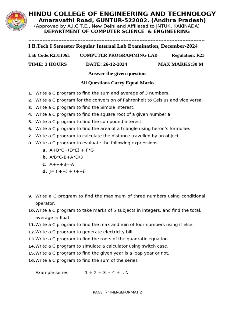 Lab Code:R231106L COMPUTER PROGRAMMING LAB Regulation: R23