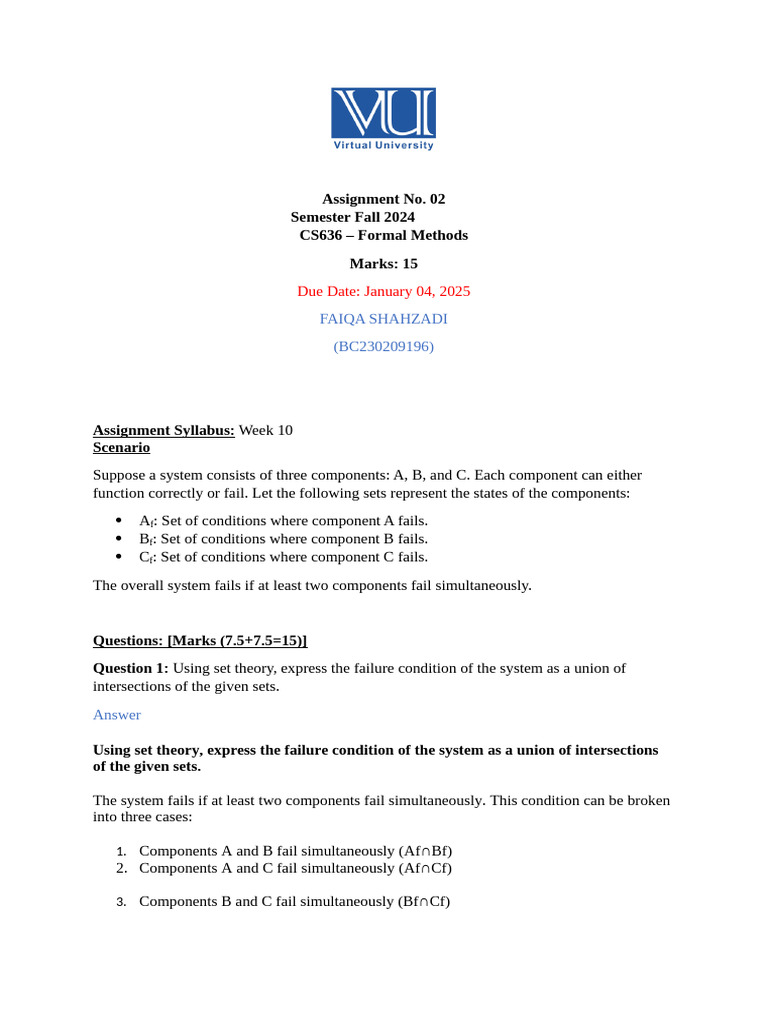 Question 1: Using set theory, express the failure condition of the system as a union of