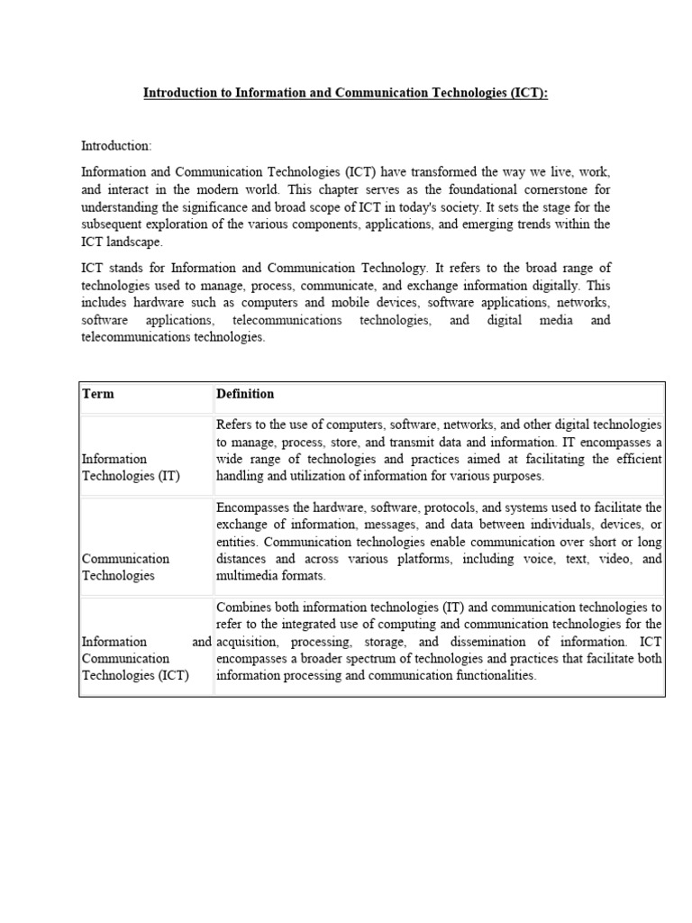 In summary, the "Introduction to Information and Communication Technologies (ICT)" section
