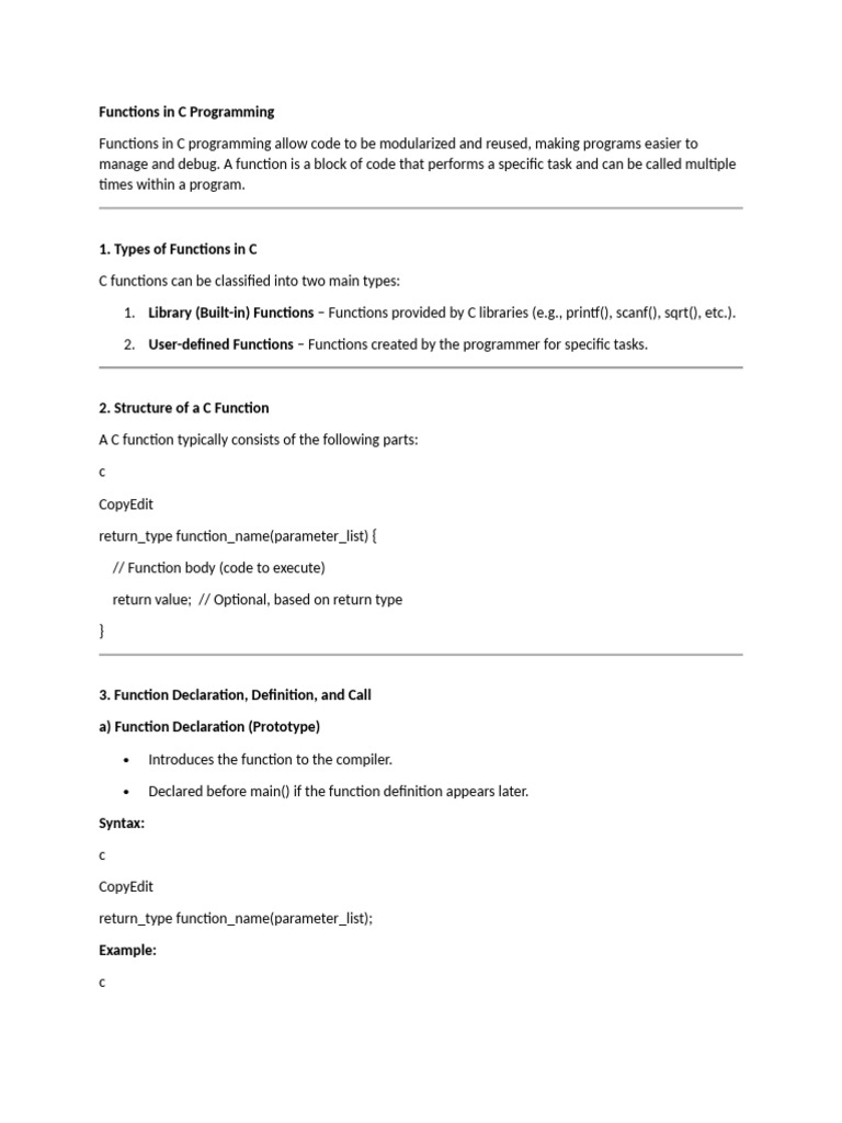 1. Library (Built-in) Functions – Functions provided by C libraries (e.g., printf(), scanf(), sqrt(), etc.).