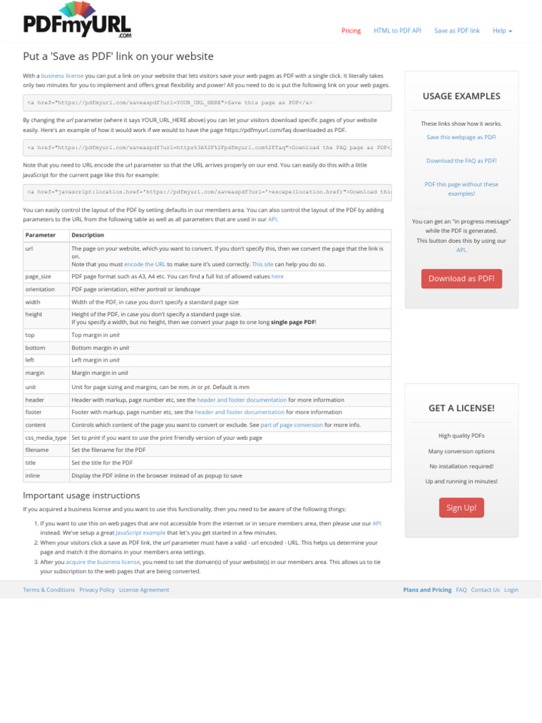 easily. Here's an example of how it would work if we would to have the page https://pdfmyurl.com/faq downloaded as PDF.