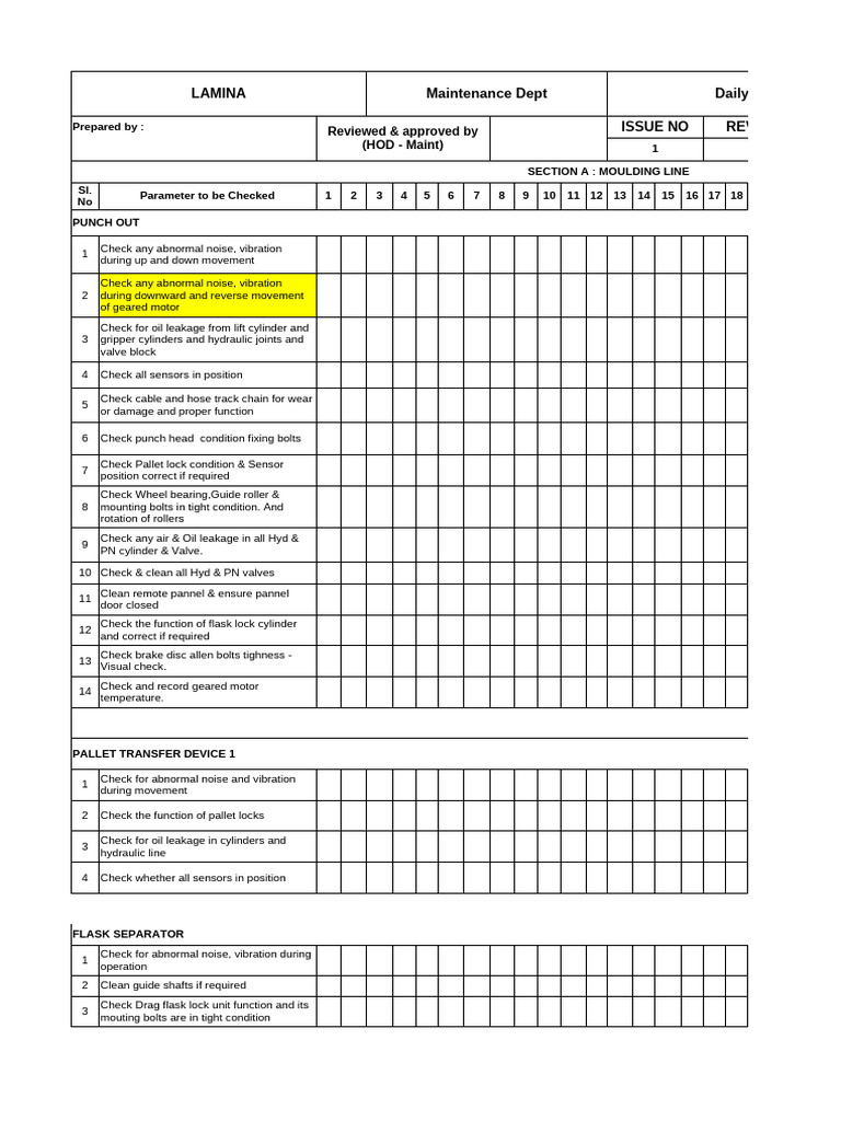 Parameter to be Checked 1 2 3 4 5 6 7 8 9 10 11 12 13 14 15 16 17 18