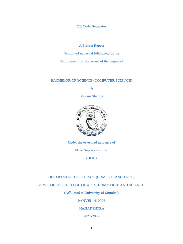 The document is a project report on the development of a QR Code Generator using Android Studio, submitted by Shivam Sharma for a Bachelor of Science in Computer Science. It outlines the project's objectives, methodology, existing systems, and proposed improvements, as well as the technical requirements and coding details. The report emphasizes the growing importance of QR codes in various applications, particularly in contactless solutions during the COVID-19 pandemic.