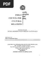 NOTE: a. Students applying for doctoral/doctoral courses or architecture should include a synopsis of the proposed area of research. Students wishing to study performing arts should, if possible, enclosed Video/audio cassettes of their recorded performances. Candidates must have adequate knowledge of English. ICCR will not entertain applications which are sent to ICCR directly by the students or which are sent by local Embassies/High Commissions in New Delhi. Priority will be given to students who have never studied in India before. No application will be accepted for admission to courses in MBBS/MD or Dentistry/Nursing. Candidates may not that Indian universities/educational institution are autonomous and independent and hence have their own eligibility criteria. Forwarding of application is thus not a guarantee of admission. A scholarship is awarded only when admission is confirmed by ICCR. Student must carry a proper visa. Students should ensure that they get the correct visa from the Indian Embassy/High Commission. Government of India guideline stipulate that if a scholar arrives without proper visa and his/her actual admission at the University/Institute does not materialize, he/she will be deported to his/her country. Before departing for India the scholars should seek a full briefing from the Indian Diplomatic Mission in their country about living conditions in India/the details of scholarship/the type and duration of the course to which he/she is admitted. Scholars should inform the Indian Embassy/High Commission of their travel schedule well in advance so that ICCR can make reception and other arrangements for them.