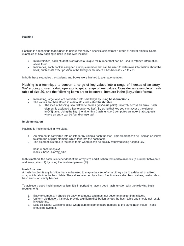 Hashing is a technique that is used to uniquely identify a specific object from a group of similar objects. Some