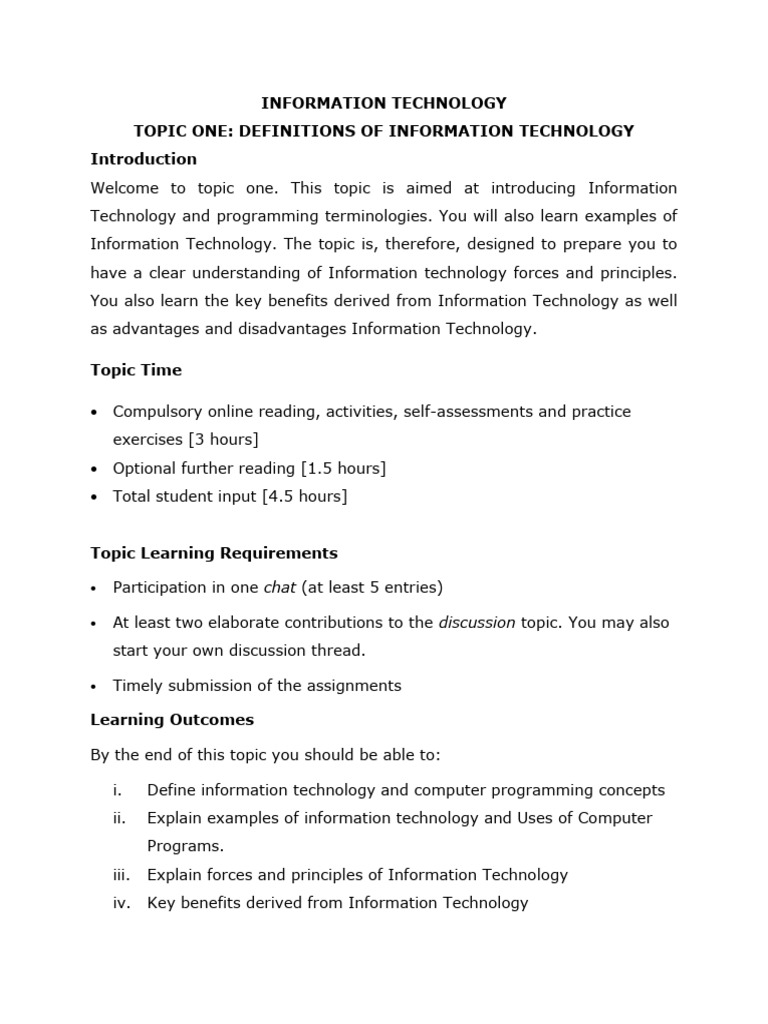 TOPIC ONE: DEFINITIONS OF INFORMATION TECHNOLOGY