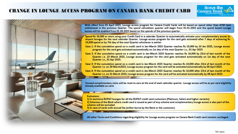 With effect from 01 April 2025, Lounge access program for Canara Credit Cards will be based on spend