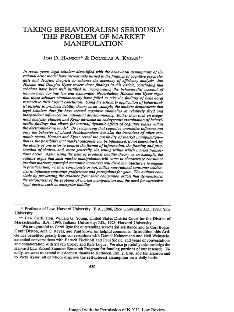 nomic actors, Hanson and Kysar reveal the possibility of market manipulation-