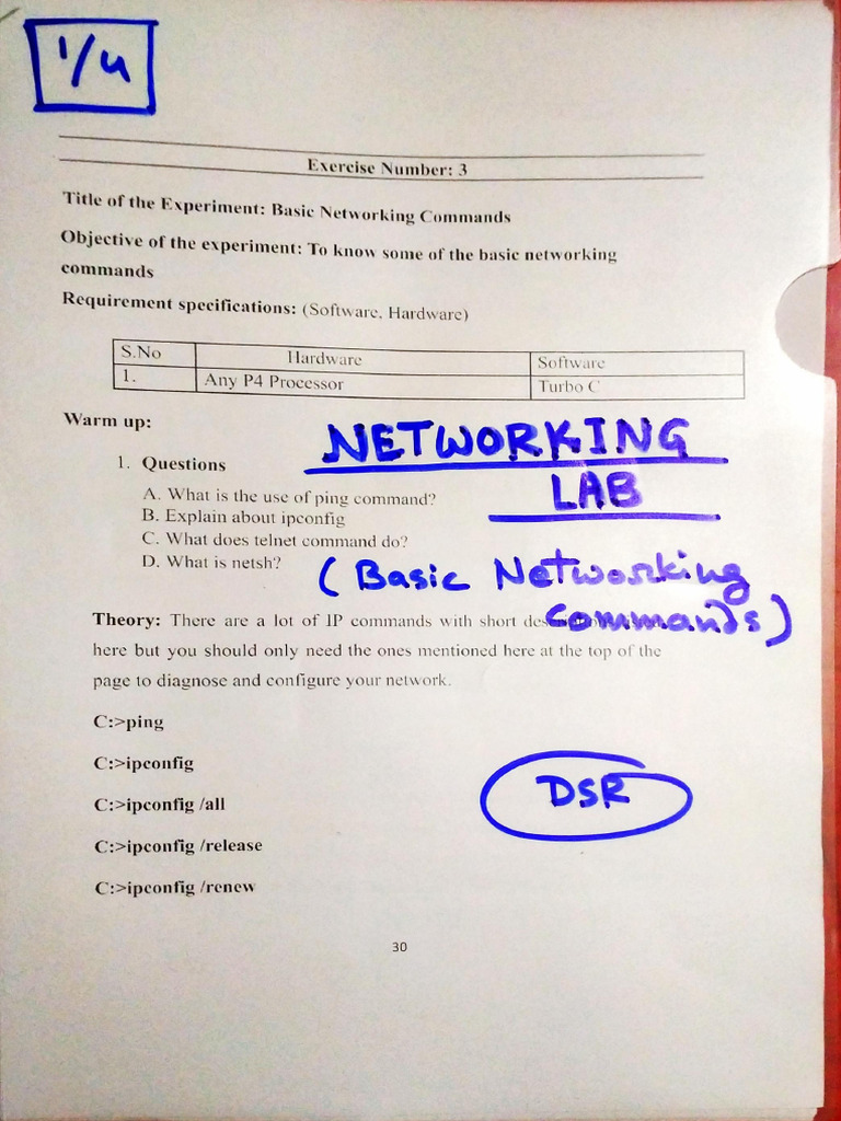The document outlines an experiment focused on basic networking commands, detailing objectives, requirements, and a series of commands used for network diagnostics and configuration. It includes explanations of commands such as ping, ipconfig, telnet, and netsh, along with their purposes and usage. Additionally, it provides a brief overview of various networking tools and commands that can help troubleshoot network issues.