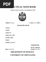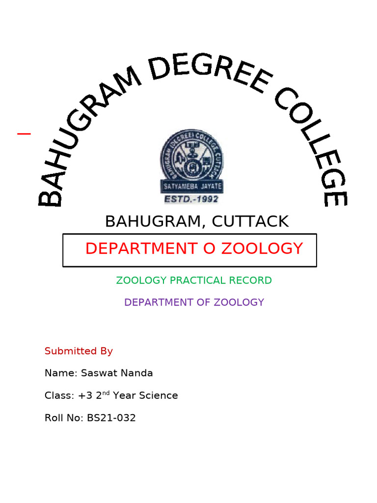 The document is a practical record from the Department of Zoology submitted by Saswat Nanda, a second-year science student. It includes the student's name, class, and roll number. The document is likely part of a zoology course requirement.