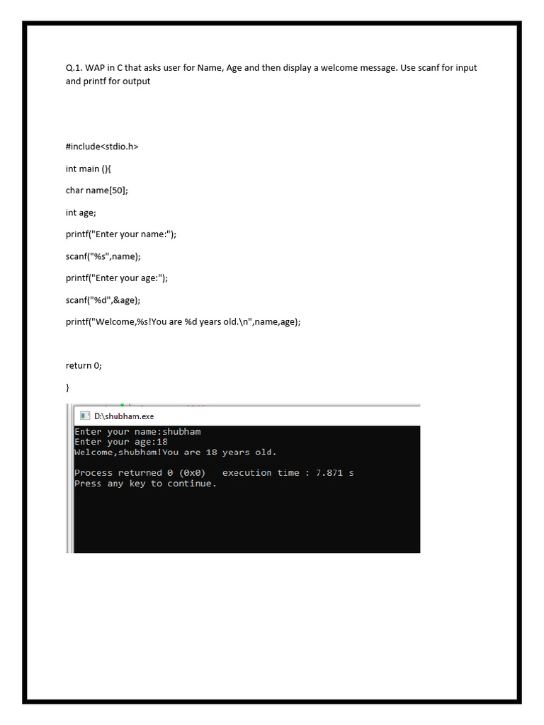 Q.1. WAP in C that asks user for Name, Age and then display a welcome message.