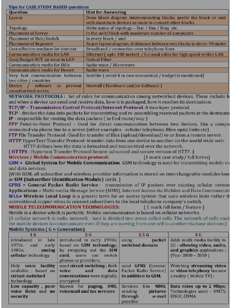 The document provides tips for answering case study-based questions, including layout suggestions, communication media options, and network protocols. It covers various aspects of networking, mobile technologies, cybercrime, and database management systems. Additionally, it discusses security measures, intellectual property rights, and the evolution of web technologies.