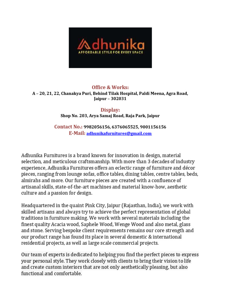 experience, Adhunika Furnitures offers an eclectic range of furniture and décor