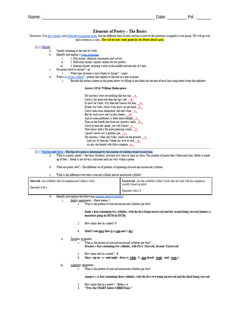 each section as a class. This will be your study guide for the Poetry Basics quiz.