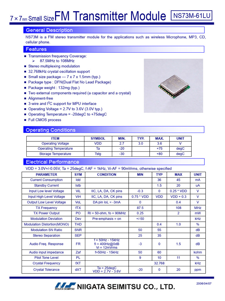 NS73M is a FM stereo transmitter module for the applications such as wireless Microphone, MP3, CD,
